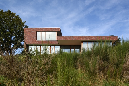 Le caractère très ouvert prédomine côté vallée tandis que les autres façades sont relativement fermées. Elles font la part belle à une maçonnerie d’aspect brut. Cette brique irrégulière et texturée, mise en œuvre en maçonnerie de joints minces, crée un contraste avec les lignes très rectilignes de la volumétrie. L’architecte apprécie aussi particulièrement les nuances qui rendent les parements très vivants.